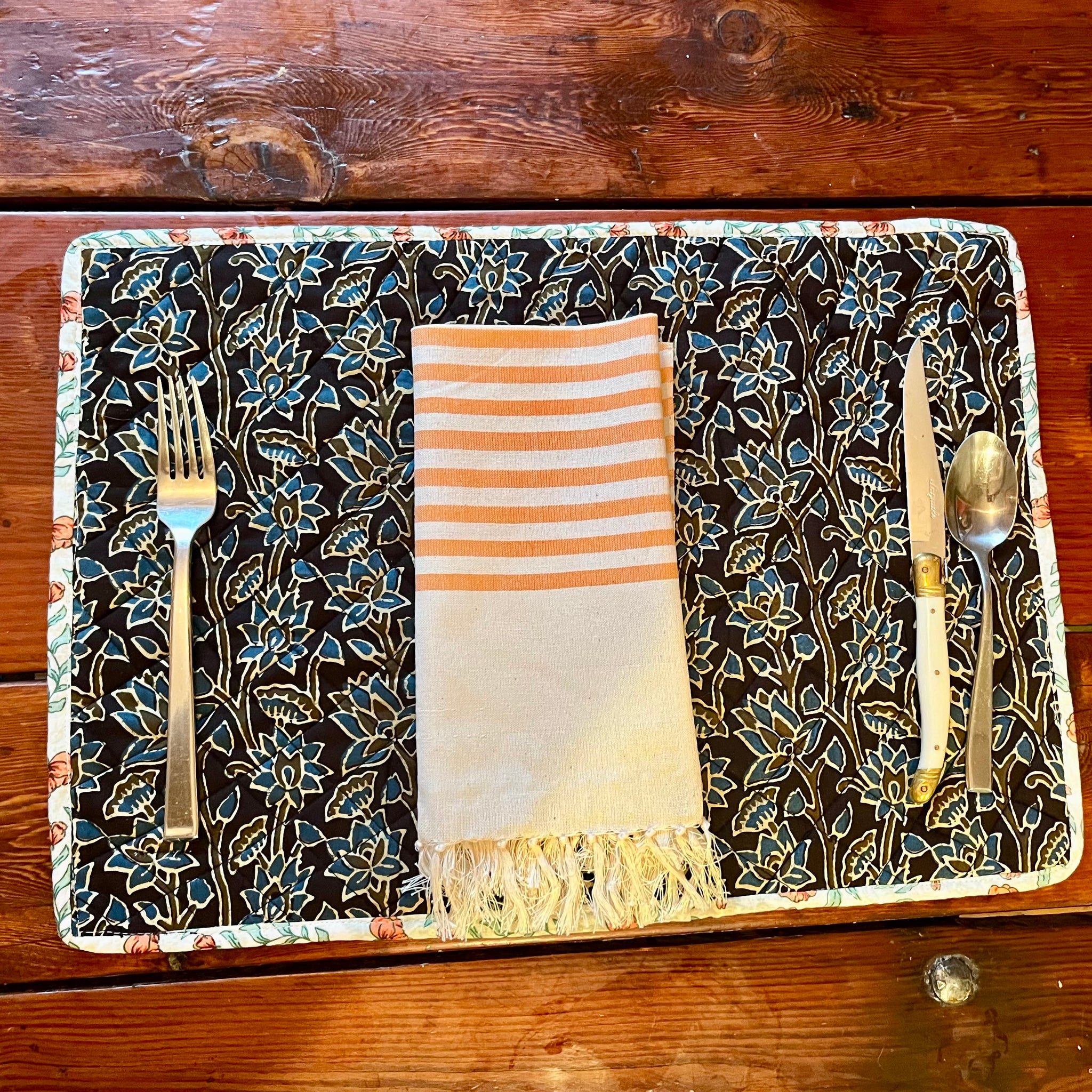 Quilted placemats in beautiful Jaipuri fabric with contrasting trim. 19" by 11". Perfect on their own or paired with hand loomed napkins