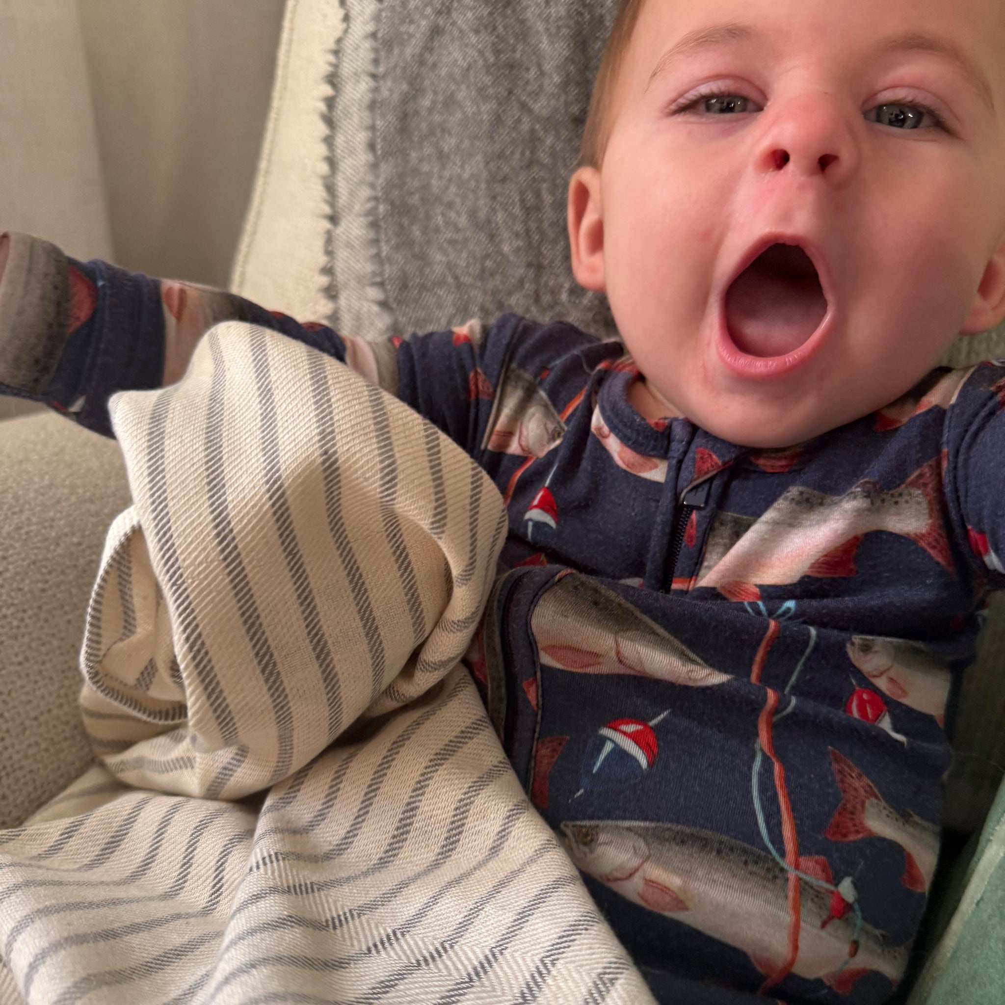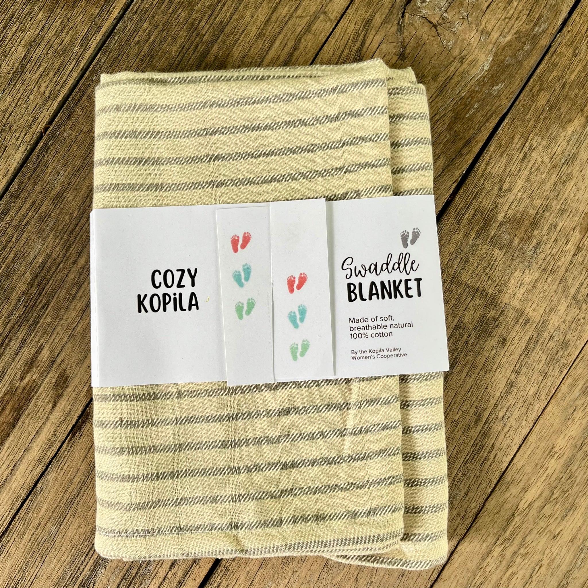 Wrap your baby in the gentle comfort of this pure hand-loomed cotton swaddle blanket. Lightweight and soft, it’s perfectly designed for delicate skin, providing cozy warmth and easy breathability to help your little one feel safe and secure. Ideal for nurturing peaceful naps and restful nights. White with grey stripes 40" by 40"